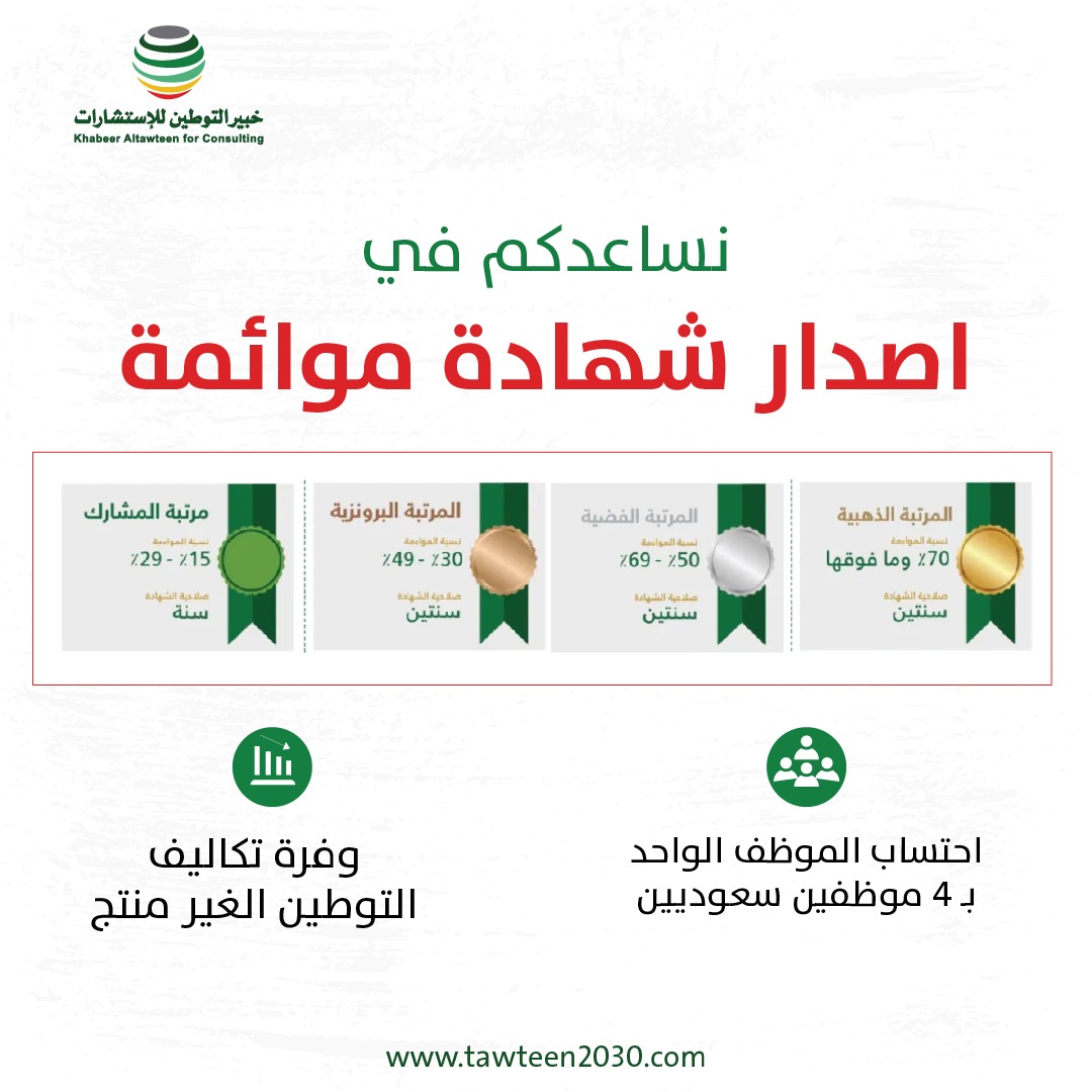 في إطار سعي المنشآت السعودية للتماشي مع متطلبات رؤية المملكة 2030، تبرز أهمية الحصول على شهادة المواءمة كخطوة استراتيجية تساهم في رفع كفاءة سوق العمل وتعزيز فرص التوطين.