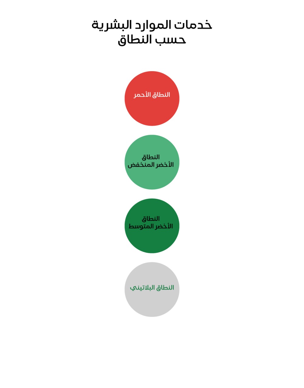 ويُصنَّف كل كيان تجاري ضمن نطاق محدد (أحمر، أصفر، أخضر، أو بلاتيني) بحسب نسب التوطين لديه، ومن خلال هذا التصنيف تتحدد طبيعة الخدمات التي يمكنه الحصول عليها.